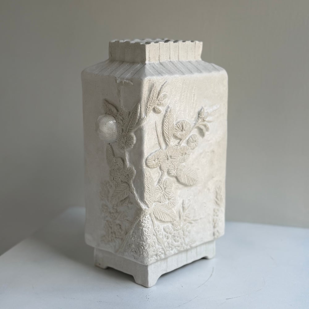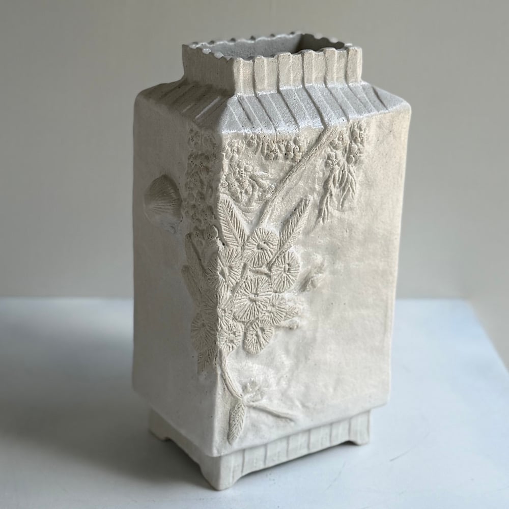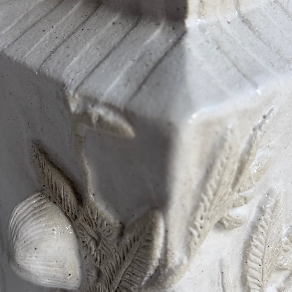 It is handmade from a slightly rough pale clay and then part glazed with a white glaze around the decoration, leaving the detail clear.