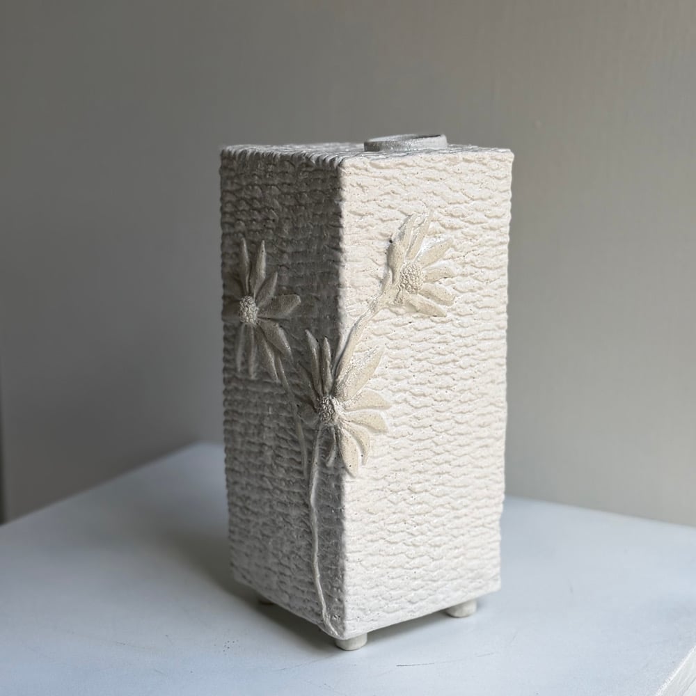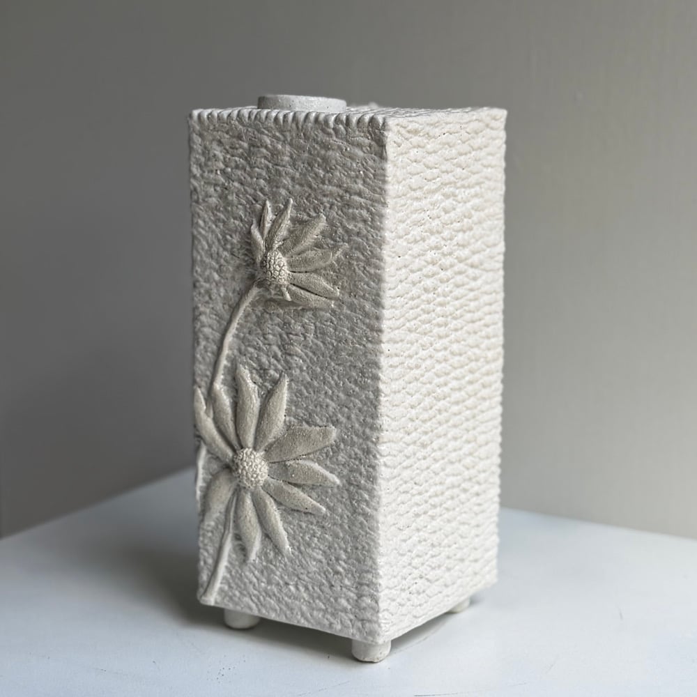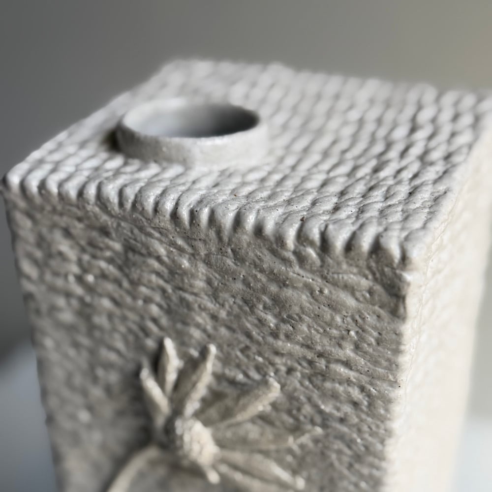 The vase is handmade from a slightly rough pale clay and then part glazed with a white glaze around the decoration, leaving the detail clear.