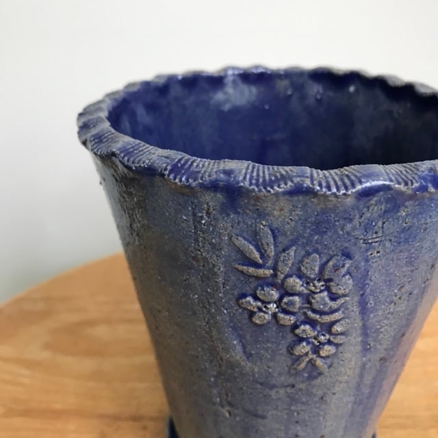 A very sweet little plant pot with a wax flower stamp on the front and a scalloped shell age around the top. It has a drainage hole so you can plant directly into it and a small coaster to keep the base off the table.